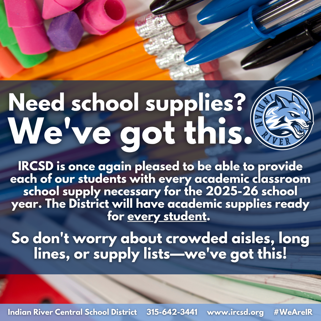As a reminder, the schools of the Indian River Central School District will be closed from November 26-28, 2025 in observance of the Thanksgiving Holiday. We look forward to welcoming our students back to school on Monday, December 1, 2025.